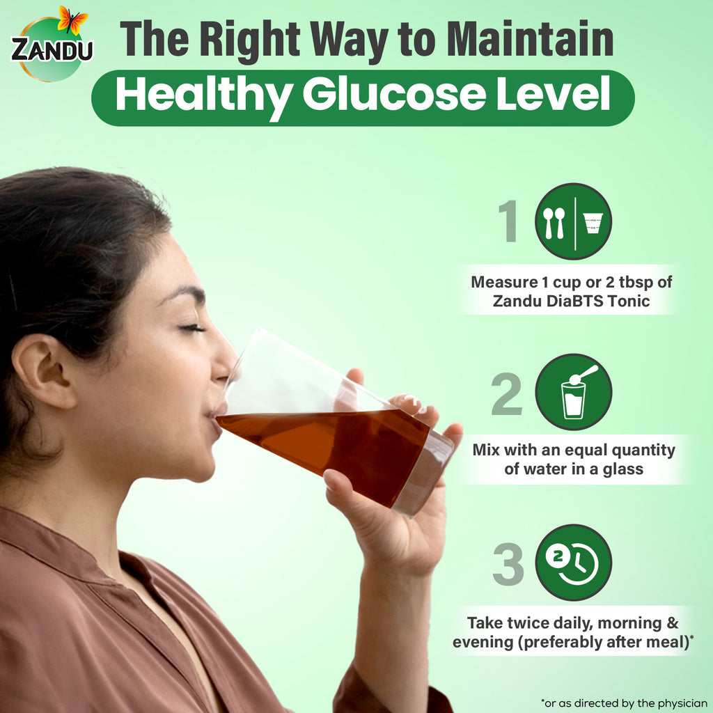 Zandu DiaBTS Tonic is made with 22 potent Ayurvedic herbs that are useful in maintaining healthy glucose levels and supporting overall metabolic health.