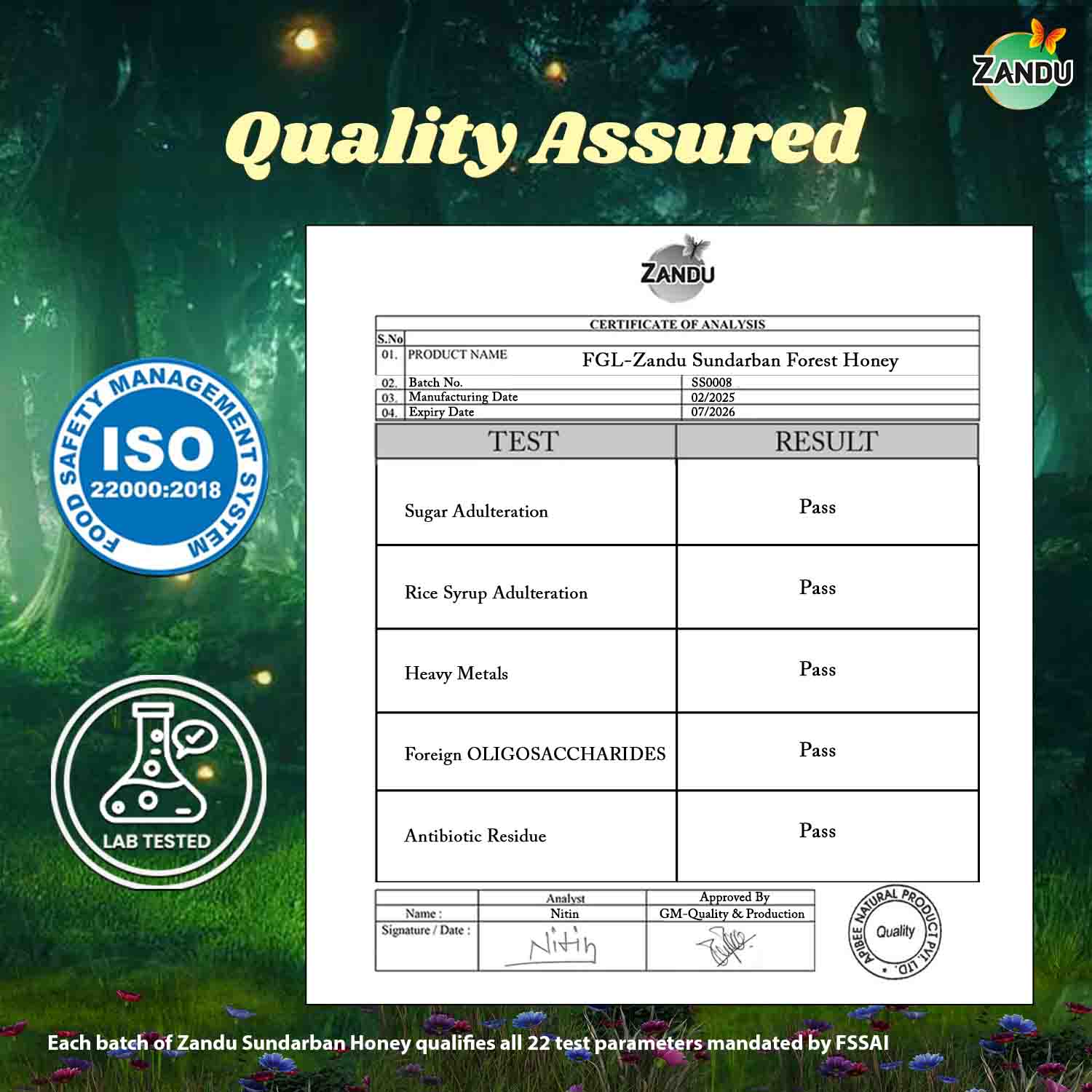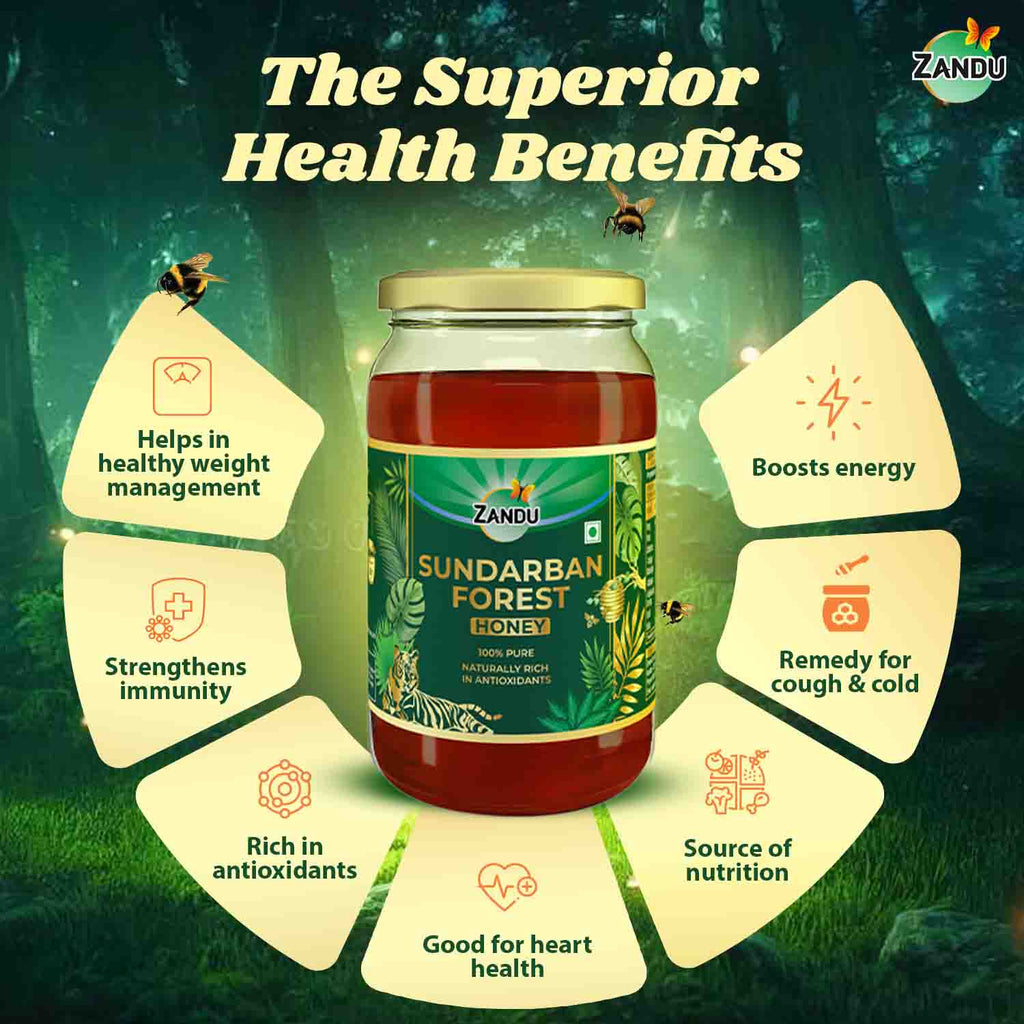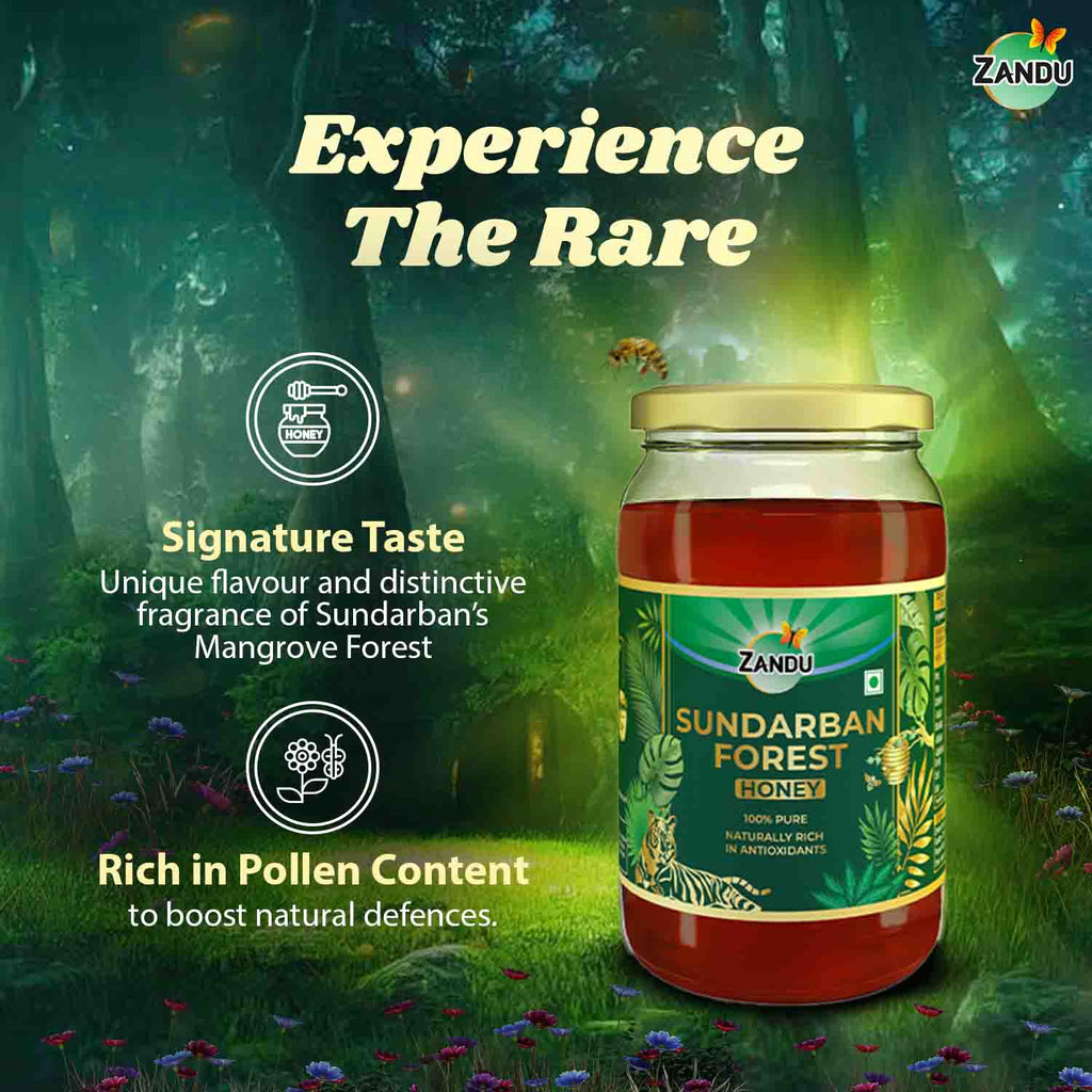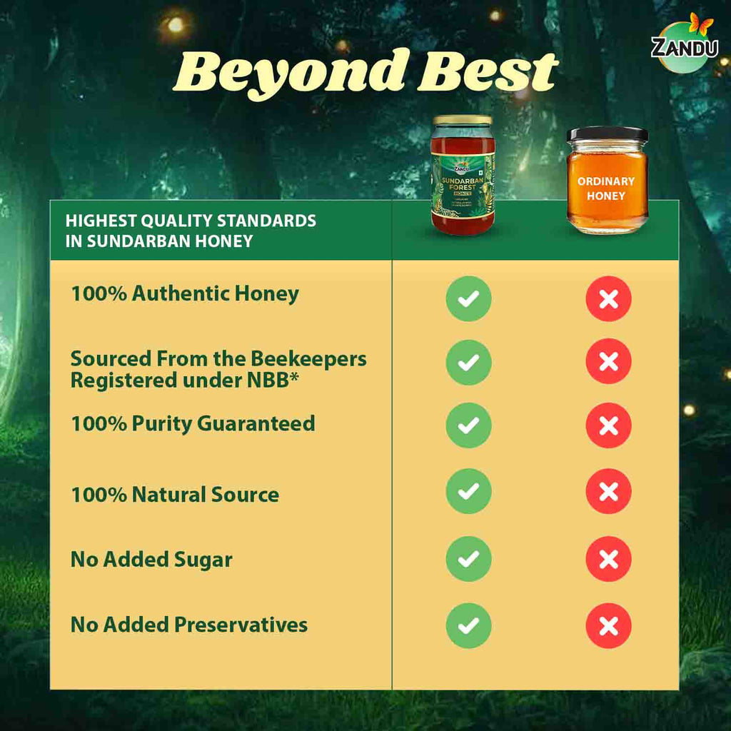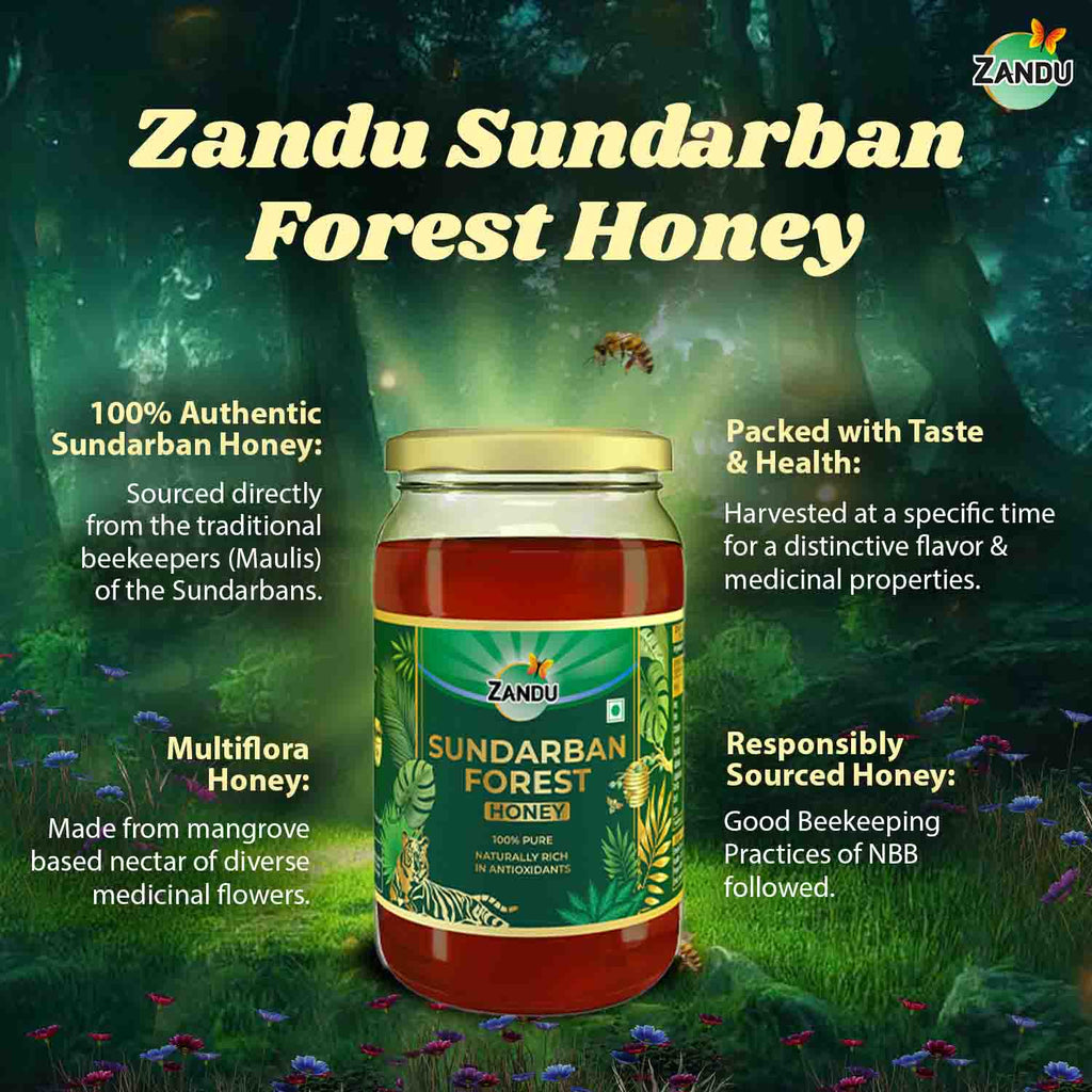Zandu Pure Honey Sundarban Forest is 100% authentic and free from adulteration. It is sourced directly from the Sundarban Forest by our own chain of beekeepers and there is no further sugar, color or preservatives added.